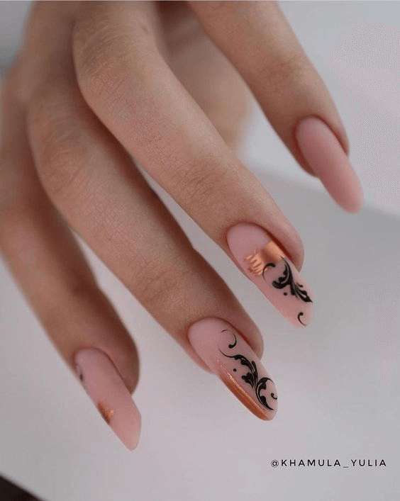 This nail art turns your fingertips into a graceful work of art. Short almond-shaped nails offer a practical, contemporary base while intricate black swirls dance over a subtle pink ombré. This look is sophisticated yet playful, making it a timeless choice for brides who love a touch of creativity while staying rooted in natural elegance.