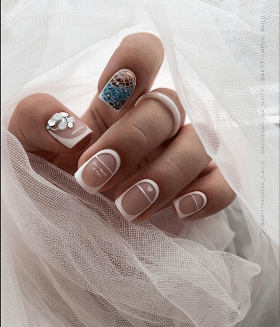 If your wedding style leans toward fairytale romance, consider this dreamy look. Medium-length square nails are dressed in intricate lace-like patterns and tiny pearl accents that create an ethereal feel. It’s the ideal choice for brides who want to infuse a touch of whimsy and vintage charm into their natural nail look.