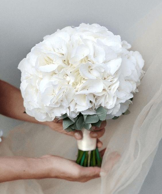 Hydrangeas, known for their symbolism of gratitude and heartfelt emotion, offer a voluminous and cloud-like effect when clustered together in pure white. Their rounded bloom clusters bring fullness and texture to the bouquet, while subtle green foliage peeking from the base adds natural balance. This arrangement is perfect for brides who seek simplicity with impact—ideal for contemporary bridal aesthetics featuring slick buns, pearl accessories, and structured gowns with architectural cuts.