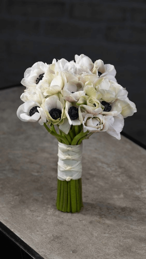 Delicate ranunculus blooms meet the boldness of white anemones with dark centers to create a bouquet that feels both poetic and striking. The contrast of soft, ruffled petals against dramatic black-centered blooms introduces a layer of intrigue. Ideal for romantic boho brides who appreciate organic textures and a bit of the unexpected, this bouquet pairs well with lace-detailed dresses or soft chiffon gowns in garden settings.