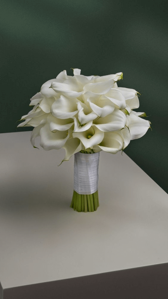 Featuring long-stemmed calla lilies, this bouquet is pure elegance in sculptural form. Each lily curves gracefully into its iconic trumpet shape, radiating sophistication. The bouquet is sleek and grand, perfectly suited for winter weddings or any event with a modern, artistic flair. Dark green foliage enhances the white blooms’ purity, and it pairs beautifully with gowns that echo the bouquet’s sculptural drama.