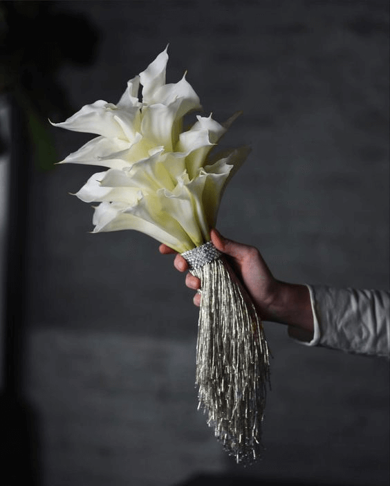 Sculptural and sleek, white calla lilies bring architectural elegance to this bouquet, enhanced further with sparkling crystal tassels for a touch of glamour. The bouquet’s elongated shape echoes sophistication and pairs beautifully with formal ball gowns or modern sheath dresses. Perfect for evening weddings or luxurious venues, this arrangement captures the bride who wants to honor tradition with a dazzling twist.