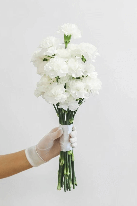 Once considered traditional, carnations are back with renewed appeal. When gathered tightly in white, they create a voluminous and textured bouquet that feels modern and lush. Their frilled petals add movement and depth, making this bouquet perfect for brides who value simplicity with a nod to heritage. Add a bit of greenery to soften the look or keep it all white for a chic monochromatic effect.