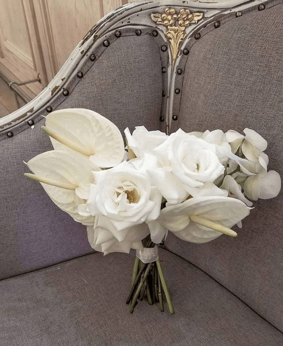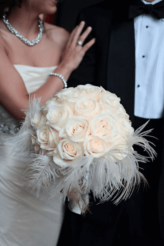 In this dreamy bouquet, creamy white roses form a spherical base, radiating elegance and soft sophistication. Their plush petals are delicately embraced by white feathers, creating a light-as-air texture that feels both vintage and avant-garde. The addition of feathers lends a regal, artistic flair, making this arrangement ideal for the fashion-forward bride who balances traditional romance with bold individuality. Pair this bouquet with a minimalist satin or crepe gown for a look where the bouquet becomes the star.