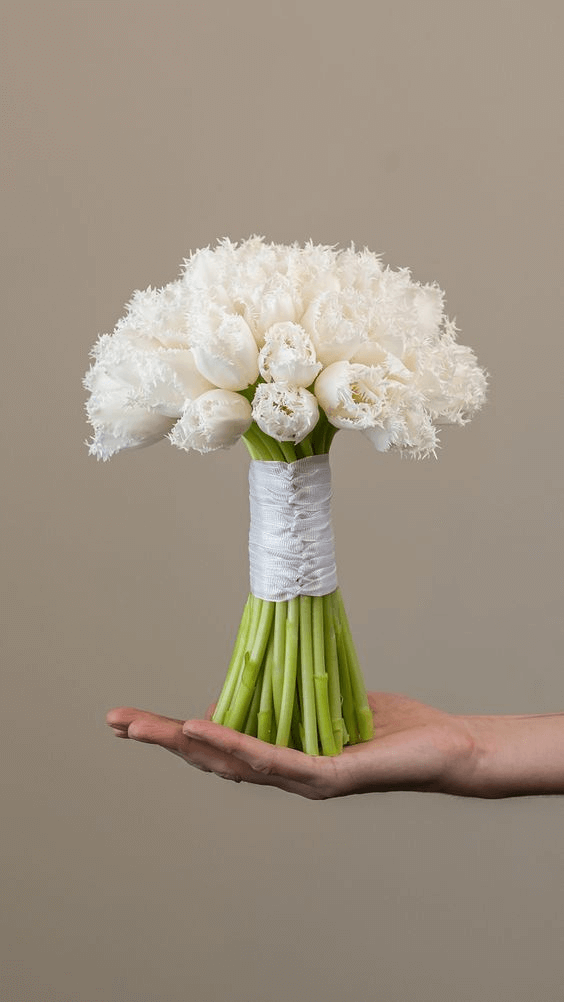 Fringed tulips offer an unexpected texture with delicate petal edges that resemble fine lace. This bouquet captures elegance with personality, suited for brides who want a blend of timeless floral charm and subtle uniqueness. Ideal for gowns that include vintage accessories or unconventional cuts, the bouquet adds playful refinement to both modern and romantic wedding styles.