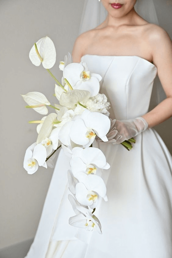 White orchids offer unparalleled elegance, and when arranged in a cascading silhouette, they create a waterfall-like effect that exudes luxury. The trailing blooms flow with ethereal grace, lending themselves beautifully to modern bridal gowns with clean lines, especially mermaid and trumpet silhouettes. This design appeals to brides who want their bouquet to mirror movement and grace, a nod to modern luxury without forgoing the symbolism of pure, enduring love.