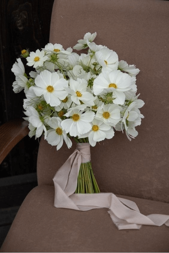This bouquet combines white cosmos and daisies to evoke youthful charm and the breezy joy of a springtime meadow. The bouquet feels like it was freshly plucked from nature, making it ideal for rustic barn weddings, open field ceremonies, or garden venues. A sage or taupe ribbon tie adds just the right touch of muted color, creating a laid-back, boho aesthetic full of warmth and personality.