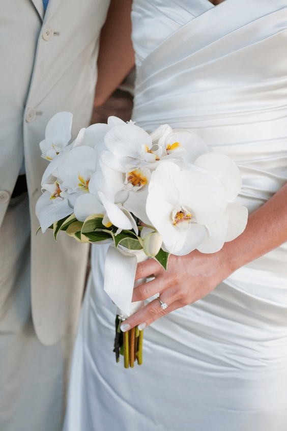 White orchids convey peace, serenity, and refined taste. This bouquet’s minimalist design focuses on highlighting the orchid’s natural form, with green leaves offering contrast. The result is an arrangement that feels fresh, graceful, and contemporary. Pair it with sleek gowns made of satin or silk to create a refined look that’s timeless and clean.